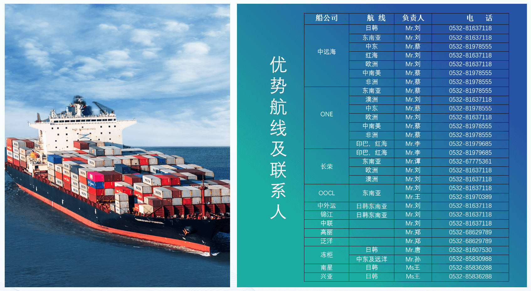 華航捷運(青島)國際貨運代理有限公司,成立于2014年,注册资金500万人民币,是国家商务部批准的具有一级货运代理权的专业化现代综合物流企业。具有交通部颁发的无船承运资格(NVOCC),是QIFFFA(国际货运代理协会)和ISEA(国际航贸企业联盟)会员单位。我司可依托青岛,上海,深圳,天津,宁波,广州等全国口岸,专业承办海运、空运、散杂货的进出口运输业务,我们与MAERSK、MSC、EVERGREEN、COSCO、YML、CMA、KMTC、HPL、ONE、TSL等多家主流船公司建立并保持长期稳定的战略合作,享有优势运力与舱位保障。我们以高素质且经验丰富的团队、高效物流平台和覆盖广泛的代理网络为基础,致力于为客户提供安全、稳定、便捷的综合物流解决方案,是一家注重服务品质、布局全球视野的现代化国际货运代理企业。
